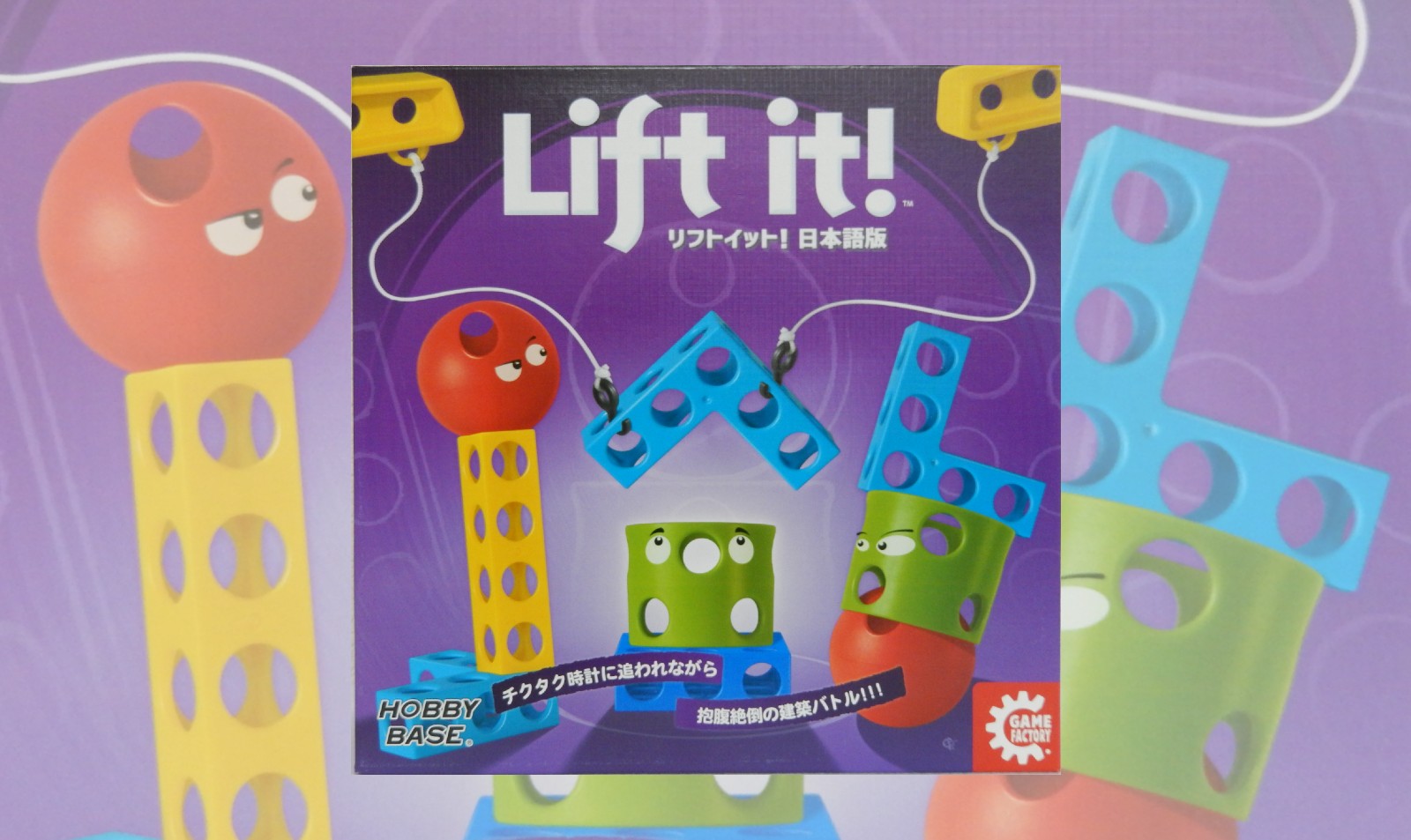 箱表面にクレーンで吊られたブロックが描かれていて面白さが伝わるイラストです。